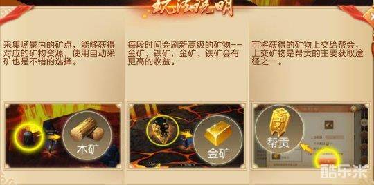 矿洞秘境融合了PK与采集的玩法,场景内存在金、银、铁、木、矿石等资源,玩家可以进行采集,这里最好的资源为金,最差的为木,金可以进行帮会建设或换取帮贡,而其他资源,只能换取帮贡,无法用其进行帮会建设。