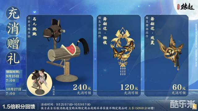 全新充消赠礼上线!9月25日7:00-10月27日7:00活动期间,侠士充值消费达到对应档位,即可免费领取三档好礼!最高充消第三档可得全新奇趣坐骑「马儿跳跳」,三档豪礼梯度放送,满足不同需求,助力侠士焕新江湖行装!