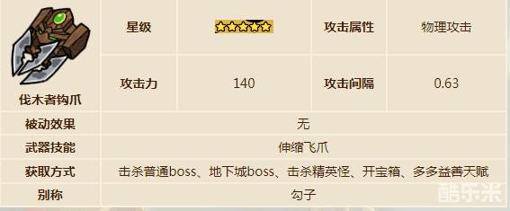 伐木者钩爪:属于一个五星物理性攻击,装备攻击力是140,攻击间隔是0.63秒。在飞行的过程中,对于沿路的敌人全部都会造成伤害,而且还会形成1.5秒眩晕。