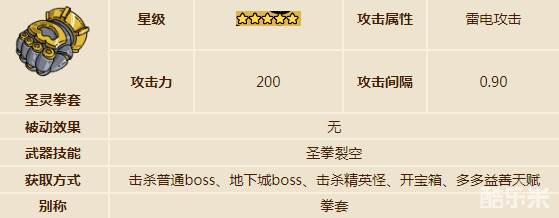 圣灵拳套:属于雷电属性的一个5星武器,攻击力达到200,攻击的间隔为0.90秒,技能伤害范围比较大,在面对一大群的敌人时就可以直接打出范围性伤害,清理小怪的效率是非常高。