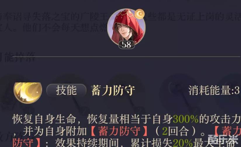 信徒头目为阳属性等级为58级,技能是消耗能量三点的蓄力防守,恢复自身生命值恢复的量相当于自身300%攻击力,并赋上蓄力防守两个回合。玩家在蓄力防守期间,可以通过打掉boss累计20%最大生命值解除该效果。