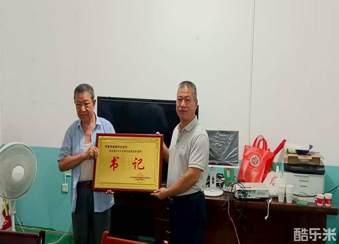 随之,赵轶又向周至县历史文化研究会终身名誉会长李瑞祺颁发了印有“同意李瑞祺同志担任:周至县历史文化研究会党支部(临时)书记”字样的金色牌匾。李瑞祺书记对本会18名党员和66位正式会员的信任与支持表示感谢!并郑重表态:不负众望,愿与大家团结一心,努力奋斗,搞好历史研究会的学术研究工作,为助力周至县现代化建设做出新的贡献。全体与会人员报以热烈的掌声。