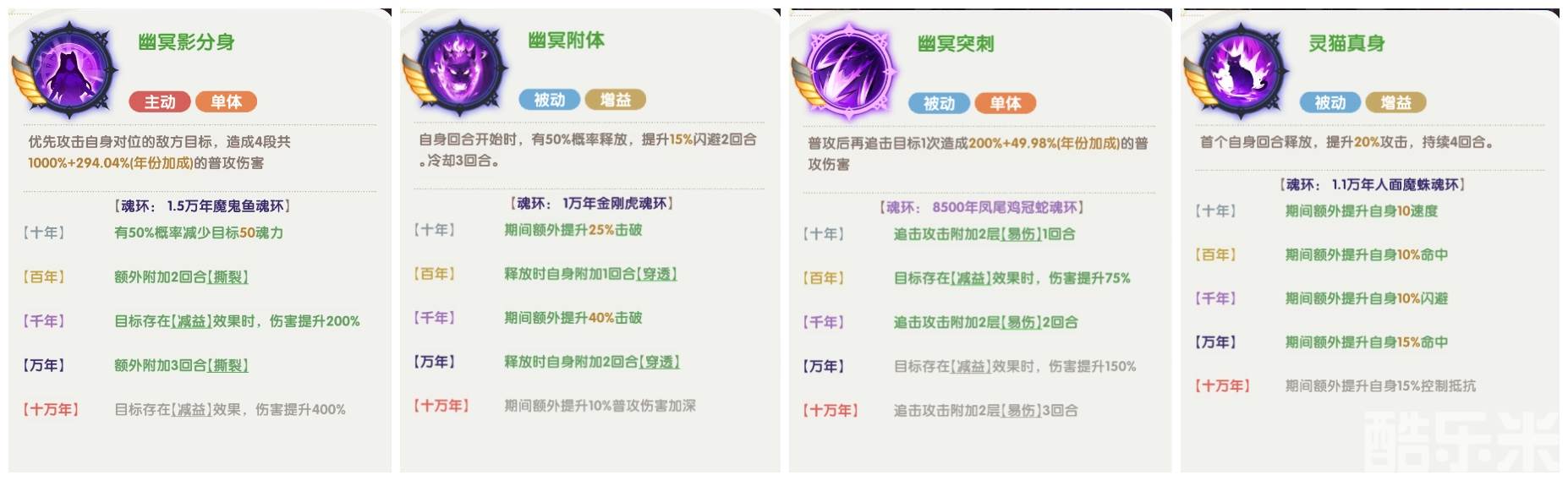 朱竹清的招牌技能是“幽冥影分身”。这是一个单体攻击技能,能够优先攻击对位敌人,并打出四段伤害,总伤害比例非常高,能在短时间内给敌方造成巨大压力。她的“幽冥附体”则是一个被动增益技能,每当回合开始时,都有一定几率触发闪避提升效果,让她在面对敌方集火时具备一定的生存空间,冷却时间也较短,能够持续提供保护。