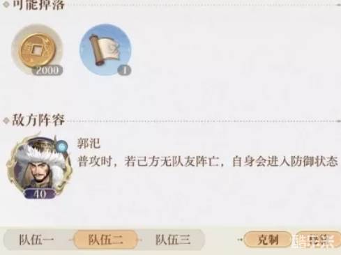 这个关卡是玩家在独自回广陵的途中才遇到了敌人郭汜,他是董卓的副将,也是烧毁绣衣楼据点的人,他是水属性的敌人,等级达到了40级,并且在攻击的时候,如果己方这边没有队友阵亡,则会让自身进入防御状态。下面和酷乐米小编一起来看看吧