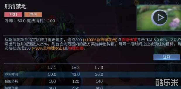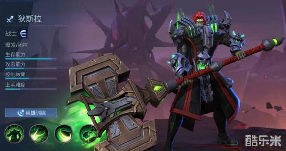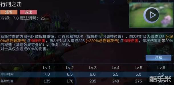 一技能复仇之击,向前方挥动大锤产生地裂,地裂会蔓延出去造成物理伤害,裂痕命中的第一个目标会钻入体内进行减速,同时增加自身移动速度,之后裂痕在目标身上爆炸,造成一次额外伤害。二技能行刑之击,向前方扇形范围内挥舞大锤连续攻击三次,在挥舞期间可以手动调整方向,每次攻击都会附带减速效果,如果输出目标是小兵则只有60%的伤害。三技能效果为跳跃到指定区域并造成范围伤害,之后将刑台召唤出来减速敌人,刑台会向范围内的敌方英雄伸出勾锁,每隔一段时间就会将目标进行拉扯。