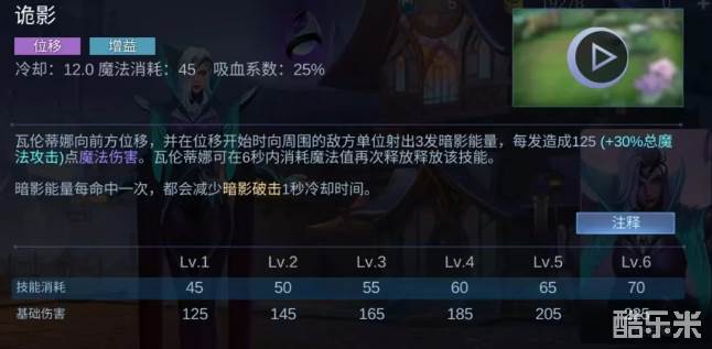一技能对前方目标造成魔法伤害并附加减速,还会对被命中的敌方英雄添加印记,如果技能伤害到了有标记的目标,会造成额外恐惧效果。二技能向前方位移,在位移开始就向周围发射暗影能量,造成魔法伤害,还可以在6秒内消耗魔法值再次释放该技能。释放出的能量每命中一次都会减少一技能冷却时间。1、2技能组成小连招在线上消耗能力极强,如果能够准确释放让暗影能量尽量多的命中,一技能可以频繁释放。