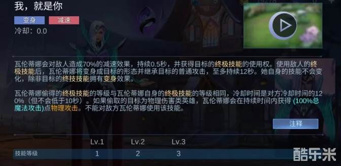 三技能对敌人造成高额减速并获得目标终极技能使用权,当使用偷来的技能后,瓦伦蒂娜将变身为目标形态,自身技能不会变化。偷来的技能和本身技能等级相同,冷却时间则比对手更长,如果偷去的目标是物理伤害类英雄,瓦伦蒂娜也会在大招持续时间内获得将魔法攻击100%转化成物理攻击的效果。