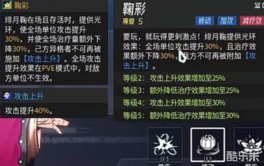 绯月鞠的第二技能是一个很有意思的技能,他在释放之后会获得一定的负面效果,二技能鞠彩是可以在全场中释放一个光环,能够将己方的所有角色整体攻击力都得到提升,但是与此同时他的负面效果也比较明显,此时玩家们想要治疗己方的角色时会发现治疗效果相较于正常较低,并且在使用二技能后,己方全体都不会再受到任何的增益状态buff,他的二技能辅助是需要玩家们牺牲一定的其他收益来获得的。