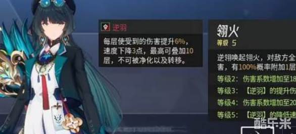 他的二技能翎羽则属于是被动技能,无论敌方被施加了什么减益状态Buff,逆翎都可以直接上去追加一层逆羽,他的被动技能完美的与一技能相互辅助,极大的增强了逆翎的整体攻击辅助性能,需要注意的是当逆翎在队伍中时,敌方行动结束后,己方都会获得行动速度的buff,可以说带上逆翎就是意味着本次战斗都将进入快节奏的形式。
