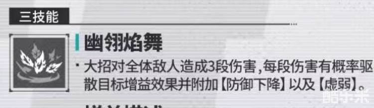 目前来看他在阵容中是一个非常有前景的潜力股,在阵容中的搭配是非常不错的选择,首先就是他的一技能可以很好的对对方造成很大的限制伤害,他的一技能可以对全方敌人都造成一定的伤害,并且会增加一个逆羽的效果,逆羽可以叠加,叠加的越多,目标所受伤害越高,与此同时,敌方的行动速度也会相对降低,可以给己方带来很大的优势。