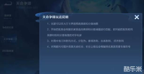 王者荣耀S41赛季开启之后,上线了全新的1v1竞技玩法天命争锋,王者荣耀天命争锋玩法介绍可以帮助大家更好的体验这个玩法,在对战中有着专属的机制与地图设计,可以让玩家更加专注于英雄的具体操作与对战中的战术规划,不管是追求提升英雄熟练度操作的过程,还是追求纯粹的1v一对抗竞技,大家都可以在这个玩法中,追求自己喜欢的乐趣。下面和酷乐米小编一起来看看吧