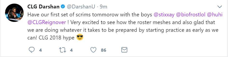 明天我将和4个队友一道进行他们的首场训练赛。我非常想知道我们的队伍将如何契合,同时我很高兴我们现在所做的一切都是在为我们的新赛季做准备。CLG 2018加油!