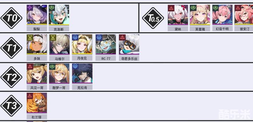 T0:梨梨、克洛斯。T0.5:黛纳、芙蕾雅、幻音千明、彼安汀。T1:多琪、马维尔、月夜见、RC-77、寻愿多乐丝。