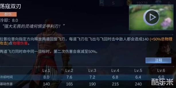 当拉普拉普造成伤害时,自身会增加勇气祝福能量,当能量叠满时下一次普攻将变成强化状态,会直接冲向目标造成伤害,并使拉普拉普获得护盾。一技能当处于双剑分离状态时。向指定方向发射两道回旋飞刃,飞出和飞回都会对敌方造成输出。当处于大剑状态时,举起大剑蓄力之后挥舞大剑劈向选定方向,对敌方造成伤害加眩晕。