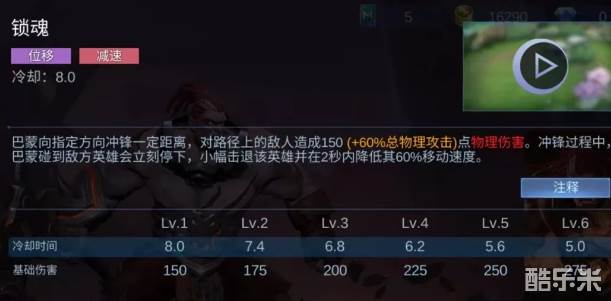 在被动的影响下,巴蒙击杀士兵或者是野怪能恢复自身5%最大生命值,如果击杀的是英雄,则恢复20%的生命值。这也就意味着在线上的时候巴蒙可以肆无忌惮的和对方换血,只要能够快速清兵,就能够保证自己血量健康。一技能向前方冲锋一段距离,对路径上的敌人造成物理伤害,在冲锋的过程中,如果碰到敌方英雄会立即停下来将其击退并,降低移动速度。