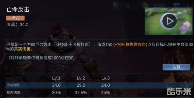 二技能使用之后在三秒钟之内提高自身移动速度,会逐渐衰减下去,同时不断挥舞手中巨斧,每次斩击都会造成伤害,最多能够斩击14次。每一次攻击都会提高敌人接下来受到的伤害,最多叠加到60%。三技能朝一个方向轰击,造成物理伤害后根据目标已经损失血量计算,附加真实伤害,对于非英雄单位最多能够造成1000点输出。