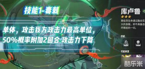 技能一(毒刺):单体,攻击我方攻击力最高单位,50%概率附加2回合 攻击力下将