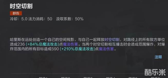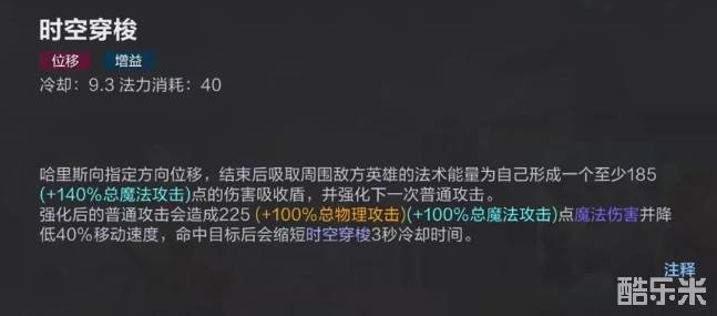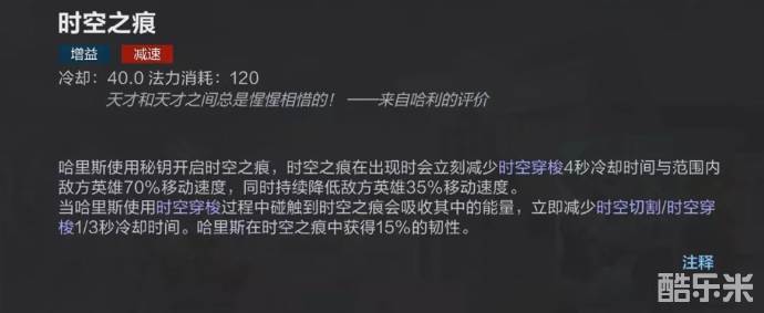 大招能开启时空裂痕,在每次触碰后都会减少其他技能冷却时间,同时降低自身受到控制的影响时间,还能降低敌方的移动速度。大招才是这名角色关键的地方,如何释放以及选择的时机和位置,将会影响整个技能连招使用以及连招输出。毕竟减少冷却时间非常关键,而且还要让尽量多的敌人受到减速影响,将对方阵型分割开。