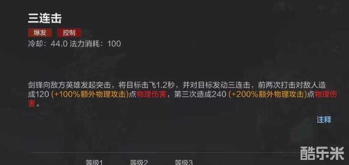 二技能是突进,既有位移效果,又可以在接近对方后使用强化后的普攻进行输出。三技能向敌方英雄发起突击,将对方击飞后造成连续三次伤害,整个技能效果非常霸气,也是常用的终结技。技能加点方面主要提升一技能,二技能有1级用于位移和触发强化普攻就够用。作为主要输出技能,一技能第1级就可以直接加,后续连招推荐123a,这样既可以将每个技能优势都发挥出来,又可以利用最后一下普攻完成收尾。
