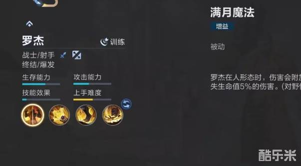 罗杰拥有人和狼这两种形态,可以在两种形态间切换,每个技能在这两种形态下都有不一样的效果,这也是这个角色使用较难的原因,必须根据情况合理选择。在人形态下,技能和普攻会给敌人附加伤害,按照对方生命百分比计算。在狼形态下,技能和普攻会给敌人造成已损失生命值百分比的额外输出,虽然都是伤害,但是计算的方式有所不同。