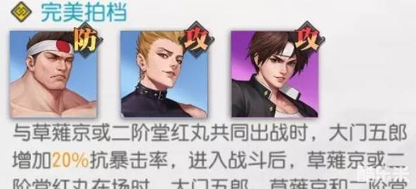 本阵容的主要特点比较类似于火队的简易版,整支队伍中的主C角色一眼就可以看出是草薙京了,作为想要组火队的玩家来说,想在开局找一个能抗住火队输出大旗的人,他绝对是最佳人选。再加上与五郎及二阶堂凑出的连携,让输出位置的坦度提升了很高,同时配合上五郎自身的减伤,前排护盾技能,就不用说队伍中还有雅典娜以及镇元斋,全体减伤加超高格挡概率,绝对能够为己方的后排的角色提供一个安心而又舒适的发挥空间。