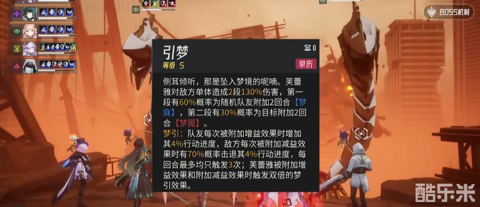 本身的能力首先用到的是普攻,普攻这个技能是叫做引梦,使用的效果就是对敌人一个单体的目标进行伤害,这里带来的伤害是一个两段连击的伤害,且在上面造成的伤害量数值是130%的伤害,而在其中第一段是有60%的概率可以触发一个状态加成的,这里触发的概率是60%,而且针对的加成目标是随机的,一位队友带来的是梦寐效果的加成,只要梦寐成功的触发的话,那么这里就会达到两个回合的生效时间。
