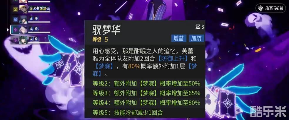 这个增益是给我方带来的效果,而减益给敌方带来的效果基本都是跟双方的行动进度有关的,而她的第二个技能叫做月梦华,月梦华这个技能是可以带来全体队友增加增益效果的,所以芙蕾雅是非常适合放在辅助增益位置上使用的一个角色,她使用玉梦华的时候可以给全体的队友来附加两个回合的增益效果,这里的增益效果体现在防御上升的数值以及梦寐的效果上面,且在同时还有80%的几率可以额外附加一层的梦寐,再给自己的队友增加增益。