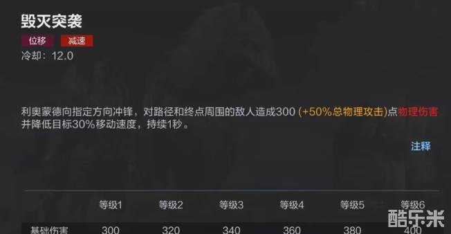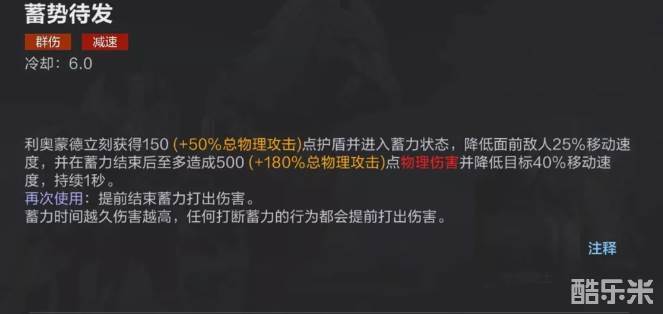 在游戏中利奥蒙德非常擅长追击和打出爆发输出,是一名很出色的战士型角色,在生存能力方面也很优秀,不惧怕对方输出,但因为自身技能缘故,所以上手难度较高。利奥蒙德对于体力值低于一半的敌人进行普攻时候会造成暴击伤害,这样在攻击残血敌人时能够做到刀刀暴击,输出极为残暴。一技能使用后自身获得护盾并开始蓄力,蓄力结束后,攻击从面前经过敌人并减速,蓄力之前可以调整方向,蓄力过程中不能移动,蓄力时间越长减速效果越好,也可以提前结束。