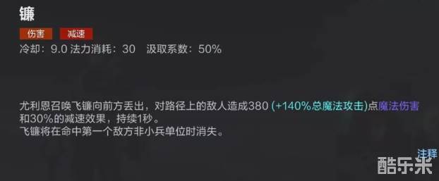 一技能向前方投掷飞镰,对路径上的敌人造成减速和伤害,当飞镰命中第1个敌人或者野怪时消失。一技能获得强化后减速效果提升,并且飞镰命中第1个目标或达到最远距离后会继续减速飞行,造成范围伤害。二技能向前方冲刺,对路径上敌人造成伤害,在强化状态下使技能可以对路径上敌人造成更高的持续伤害,并且在冲刺期间变为不可选中状态。三技能召唤出锁链丢向指定地点伤害范围内的敌人造成禁锢效果,在三技能获得强化后,对范围内敌人造成伤害,同时附加减速和击飞效果。