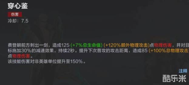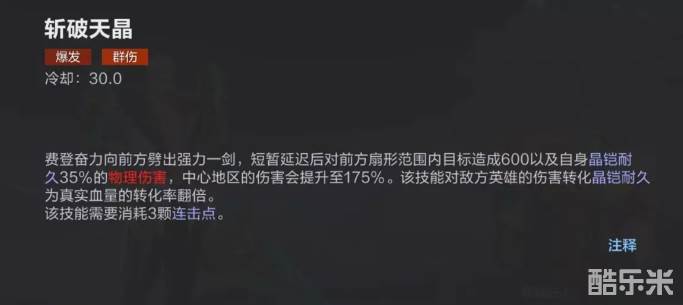 一技能对面前敌人造成伤害并附带减速效果,同时下一次普攻攻击距离提升,普攻提升攻击距离后和一技能有着相同的输出长度。二技能需要指定方向后进行位移,命中敌方英雄后停下造成伤害,下一次普攻会将目标直接击飞。三技能对周围目标造成伤害和嘲讽,施法范围比较大,当命中敌方英雄时还会提升自身防御,这样即使嘲讽过来也不会受到过多的伤害,还能够减少一二技能冷却时间。四技能对前方扇形范围造成伤害,如果敌人处于中心区域,则受到伤害更高,自身耐久储存越多,造成伤害也就越高。