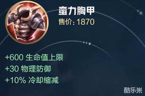 物理防御装的话更加推荐大家使用蛮力胸甲,可为你带来高额的物理防御及生命值加成,还可减少10%的技能冷却时间。有着特殊被动效果,当你每次攻击或者释放技能之后,则可提升自身的物理、魔法防御。还能增加移速,很适合上单英雄使用,可更快地接近对手。