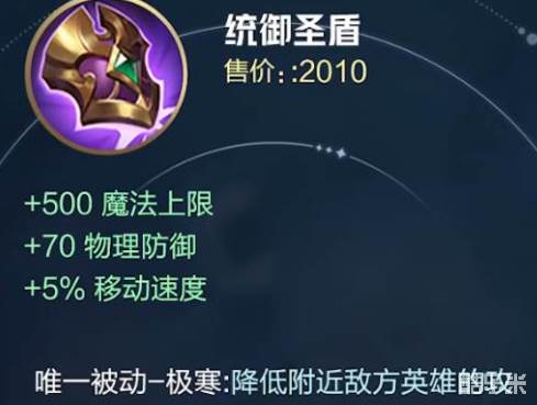 另外一件更推荐使用统御圣盾,可提升你的魔法值以及防御力。还可减少附近英雄的攻击速度,并增加自己的移动速度,还可降低对手的生命回复效果以及护盾值。只适合辅助英雄使用,这样就可提升队友们的伤害,轻松破解对手的防御。