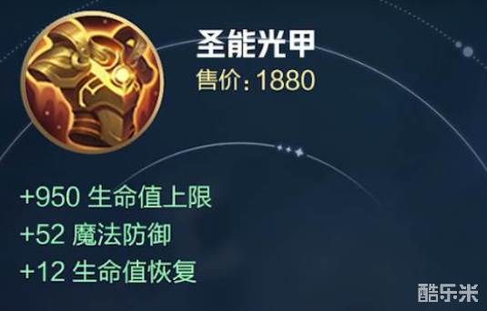 另外一件更推荐大家佩戴圣能光甲,可获得基础生命值以及魔法防御力,并且生命恢复能力可变得更强。当受到魔法伤害时,则可不断减免魔法伤害。如果英雄等级越高的话,加成效果就越好,很适合发育型的英雄佩戴。