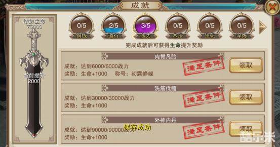 领取已完成的成就奖励可增加角色生命值,每项成就增加1000点生命值。