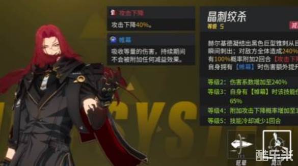 赫尔基德发动普通攻击时肩旁会凝结出数枚黑色锥刺晶体,晶体在短暂蓄力后沿直线射向目标,此技能不仅伤害输出突出,还具备控制效果,使目标无法进行行动,禁蚀绞杀技能属于范围伤害技能,凝结出巨型锥刺丛从敌人的脚底刺出,对全体敌人造成伤害,除了基础伤害外还有概率附加2回合的攻击下降,削弱敌方攻击力,终结技帷幕是大招,惟幕从身后出现,对全体敌人造成多段伤害,同时大招还会为全体队友附加伤害总量一定比例的帷幕效果。
