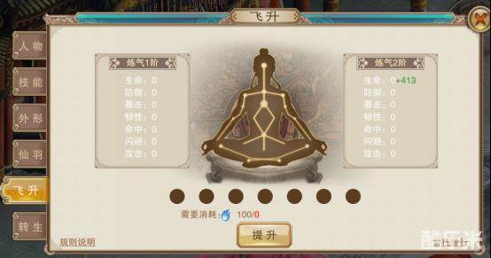 1、飞升分为10个境界,没达到一个境界都会获得专属的称号。每个境界内分为10阶。