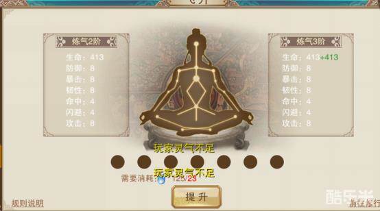 2、消耗灵气可以提升境界等级,当当前境界满10阶时,需要使用仙气突破到下一个境界之后,才能继续提升等级。