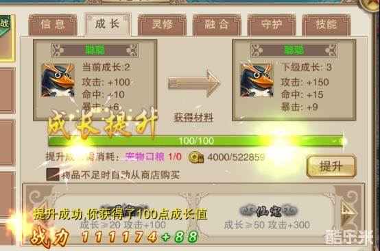 1、消耗道具宠物口粮可提升宠物成长经验值,经验值达到100时,成长等级提升一个等级。提升成长等级,可增加宠物的攻击、命中以及暴击。