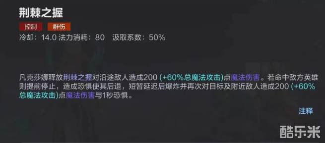 大家通过属性条就可以看出,凡克莎娜的攻击能力已经接近满值,控制效果也很好,而且上手难度极低,虽然生存能力比较差,但是有着距离上的优势。凡克莎娜伤害都会为目标添加印记,当目标被击败时,印迹会自动爆炸,对周围敌人造成范围伤害。一技能在使用时候需要选定攻击路径,对整条路就向敌人造成伤害,敌人被命中后会短暂后退,受到暂时控制,并且暴露自己的视野,这一招对付草丛里的敌人非常好用。