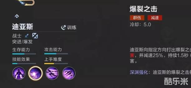 每进行两次普攻之后,第三次普攻就会造成额外范围伤害,并为自身恢复生命值,通过普攻和技能命中敌人时获得怒气,每50%怒气值都可以强化一次技能。所以通过普攻来消耗对方以及积攒怒气,是打出迪亚斯连招的关键方面。一技能指定方向后打出爆裂之击,将目标减速。二技能突进撞到目标后停下来,再次使用该技能会锁定目标,造成伤害与减速,大招需要蓄力后释放,对前方路径上的敌人造成伤害和减速。