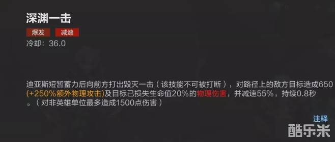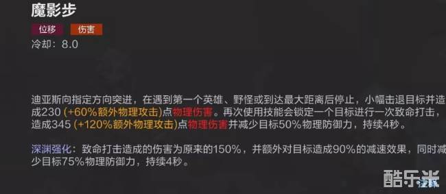 爆裂之击在获得强化后射程更远,造成伤害医提升,减速效果翻倍。二技能在得到强化后致命打击造成的伤害提升,并额外造成高达90%的减速效果,还会削弱目标75%的物理防御力,这样对方将会变得非常脆弱,方便接下来进行收割。所以二技能常常用于切入战斗,先将目标防御降下来以后,再接上其他技能或普攻。