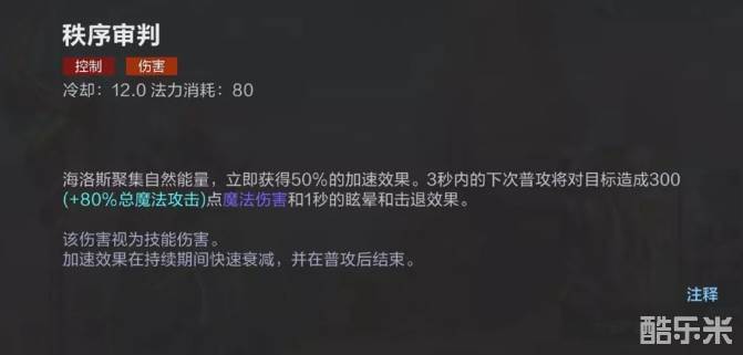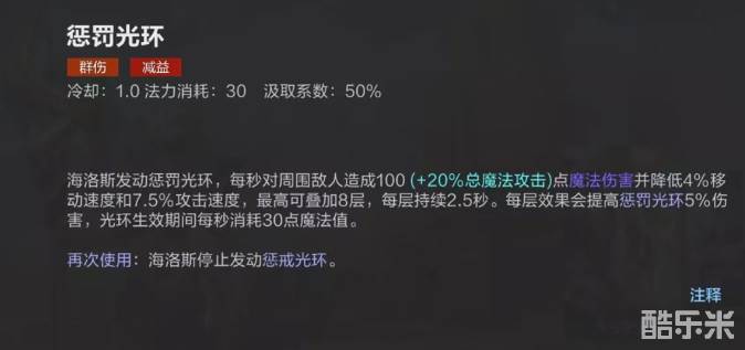 当海洛斯在魔法不足的时候可以消耗生命值来释放技能,这样就不存在因为没有蓝而无法释放技能的情况。一技能对目标造成眩晕和伤害,使用二技能后,在自身周围生成光环,会持续消耗魔法值,对周围敌人造成伤害,并降低移动速度和攻速。伤害方面并不算可观,但是降低移动速度和攻速却可以有效限制对方,而且此技能影响范围极大,在狭窄地区开团可以笼罩对方所有人,再次点击使用后就能关闭光环。