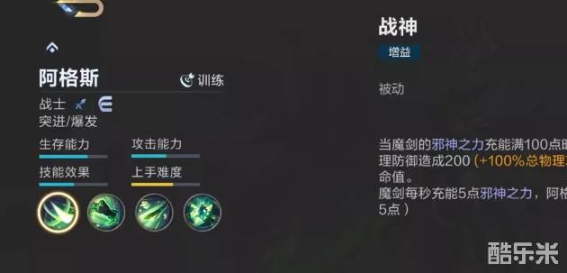 阿格斯是一名擅长突进和爆发的战士型角色,在上手难度方面比其他战士略高一些,更应该搞清楚技能效果后才能够上手。下面和酷乐米小编一起来看看吧
