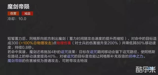 一技能向前方伸出魔能之手,命中敌人后眩晕目标,同时将自身和目标朝技能路径中间位置拉扯,再次点击使用后朝指定方向进行位移。二技能需要蓄力并且控制方向,然后刺出魔剑,对敌人造成伤害加减速效果,如果命中敌人,会对目标造成诅咒,敌人如果带着诅咒移动,会在脚下留下路径,阿格斯沿着路径追击移动速度增加。另外此路径还能起到防止对方卡视野、绕草丛这样的操作。对被诅咒的敌人进行普攻,会双倍恢复能量,加快触发被动效果。