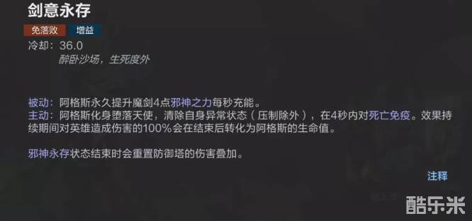 三技能在每次升级后都会提高充能速度,在使用三技能后,自身所有携带异常状态全部清除,并在4秒钟之内不会被击败,也就是血条清零后依然可以战斗,在效果持续时间对敌人造成伤害转化为自身生命值。开启大招后的阿格斯才是真正恐怖的疯狂收割者,四秒钟的无敌时间足以保证切掉大多数后排。