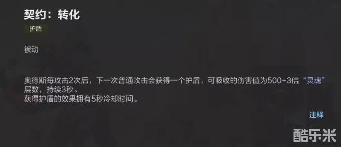 奥德斯在每攻击两次后,下一次普攻都将获得一个护盾。一技能强化自身下一次打出的普攻效果,如果利用该次普攻击败敌方单位,自身将叠加两层灵魂效果。每层灵魂效果能提升该技能额外伤害,而且是永久提升,这一点叠加起来是很致命的。在二技能开启后自身受到伤害大幅度减少,并增加移动速度,持续两秒钟。当技能自动结束或者是手动点击解除时,都会将周围敌人眩晕并造成伤害。