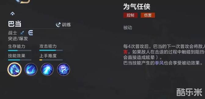 作为战士英雄,巴当自然在爆发输出和突进等方面都很有优势。在每四次普攻后,下一次普攻就会获得强化效果,命中敌人时将对方击退,并附加额外伤害。敌人在被击退的过程中如果接触到阻挡,将会受到额外眩晕效果,这就要求大家在输出时候要找好位置,尽量使自己面对敌人,然后敌人背后是地形障碍,这样可以起到额外效果。