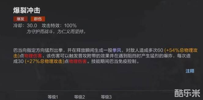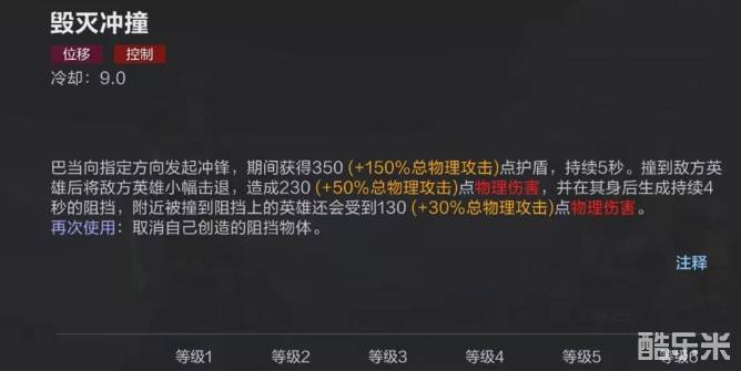 一技能需要手动调整释放路径,将路径上所有敌人击退附加伤害和减速,如果对方遇到阻碍,同样会受到额外伤害。一技能使用后可以直接触发被动击退和眩晕,最多能够储存两段。二技能也需要指定位置后发起冲锋,将对方撞倒后将其击退,自身还能获得护盾,此技能特点是使用之后直接在对方身后生成一个阻挡,这样就无需借助地形。二技能可以再次点击,将阻挡取消。三技能光速打出多拳造成伤害,可以直接触发被动效果,当敌人遇到阻挡时同样会被眩晕并产生爆炸伤害,在技能持续时间巴当本身是免疫控制的。
