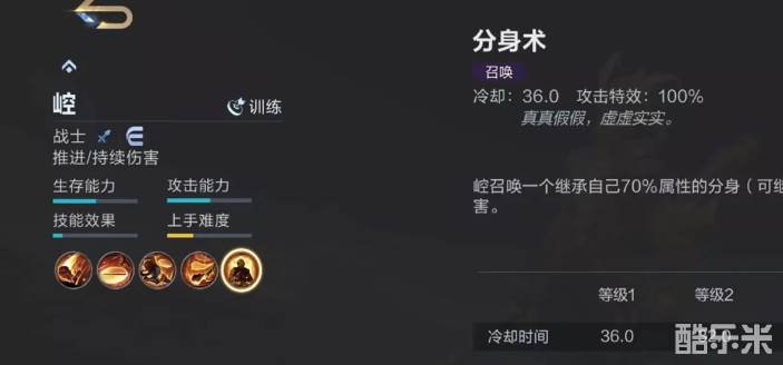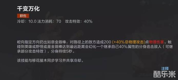当悟空对敌人造成伤害后还会降低防御,另外召唤出来的分身造成伤害,会为自己本体恢复生命值,能够召唤分身是很多玩家使用这个角色的重要原因。一技能扔出手中的金箍棒,召唤出一个分身,分身会主动攻击敌人,不需要自己操作。二技能隐身之后向前方位移,原地出现一个分身。一二技能会共享冷却时间和伤害加成。二技能是极其关键的使用技巧,很多玩家在不了解的时候往往会被分身所迷惑。