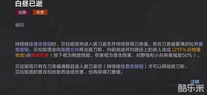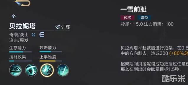 很多玩家并不将贝拉妮塔当作战士,而是走奇袭路线,其实这也是可以的,因为它的技能效果在这两者方面高度重合。通过长按普攻的方式,可以为自己手中长刀蓄力,蓄力结束后向前方突进,对接触到的所有敌人造成伤害,当使用普攻和技能打出伤害后,可以获得刀意值。一技能使用后先向后撤步,在前方留下幻影,幻影会向前方区域形成挥砍伤害,造成伤害和减速,本体会闪向前方再造成一次伤害。